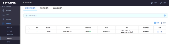 2.2在路由器上找到DNS解析设置,登录花生壳账号,会自动获取刚才申请的域名信息,设置好解析的指定wan端口。